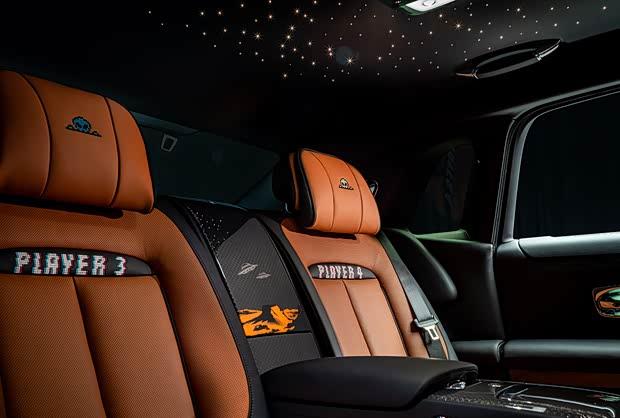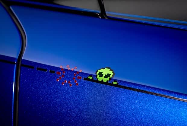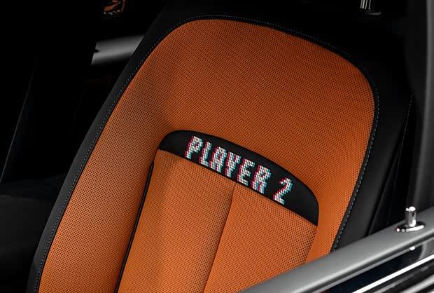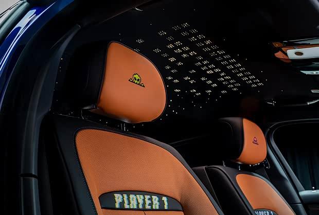 内饰以黑色与深棕色为主调,重现了1970年代末电子游戏街机的视觉语言。座椅绣有“Player 1”至“Player 4”的像素风格字样,缝线色彩取自复古街机电光色调。头枕处饰有纯色“顽皮外星人”刺绣,后排“瀑布”饰板采用科技纤维材质,镶嵌两艘不锈钢“飞碟”飞船图案,饰面中还融入了银色闪片。