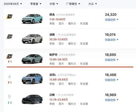 在合资品牌中型车市场,上汽大众帕萨特系列采用新老同堂销售策略,主要竞争对手包括一汽-大众迈腾、广汽丰田凯美瑞和广汽本田雅阁等车型。数据显示,帕萨特系列8月销量达18695辆,位列上汽大众当月销量排行榜第二位,成为品牌重要的销量支柱。