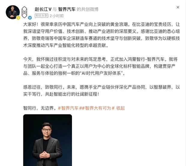 近日,智界汽车官方宣布,赵长江正式出任公司执行董事及执行副总裁。赵长江在比亚迪集团工作超过十六年,曾于2021年担任腾势销售事业部总经理兼首席共创官,主导了腾势D9的上市工作。2025年7月,他调任腾势方程豹直营事业部总经理,并于同年10月24日离开比亚迪。