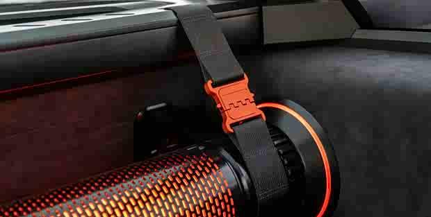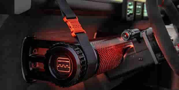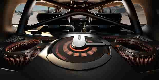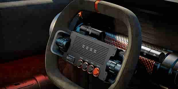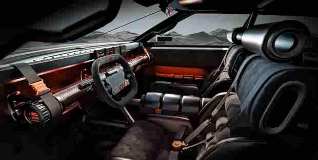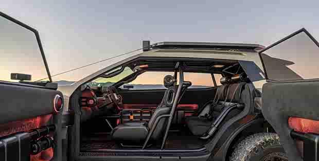 内饰部分延续了硬核风格,中控台采用贯穿式圆柱结构,中央配备齿轮装置,两侧以绑带连接。车内搭载四个可拆卸显示屏,支持个性化内容显示。赛车风格的方向盘与座椅相得益彰,后排同样配备四点式安全带。对开门设计与B柱防滚架的运用,进一步强化了整车的越野特质。