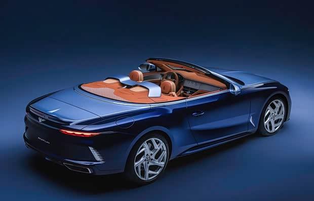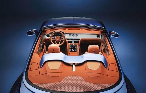 银色软顶敞篷为车身注入金属质感,双色车身衔接处采用环绕式镀铬饰条进行过渡。前后翼子板的宽体造型凸显GT车型的力量感,轮圈采用独特的Y字形五辐设计,辐条上点缀午夜蓝条纹,细节处延续“豪华美学”理念。