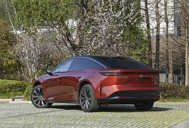 从外观设计来看,新车延续了丰田电动化车型的设计风格,前脸采用贯穿式LED日间行车灯,形成半包围造型,呈现出类似“锤头鲨”的视觉冲击力,辨识度较高。车尾部分同样配备贯穿式尾灯,后备厢上方设有扰流板,下方包围设计与前脸相呼应。车身颜色方面,提供黛云翠、丹霞红、赛博金、粹雪白、皎月银、浩瀚黑及远山灰共七种选择。车身尺寸上,其长宽高分别为5130毫米、1965毫米、1506毫米,轴距达到3020毫米。
